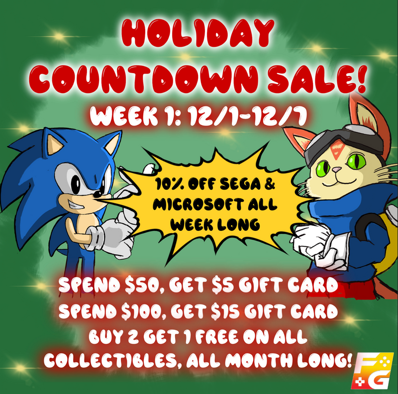 Get 10% off Sega & Microsoft for the first week of December! Also enjoy bonus gift cards for spending $50 or more, and buy two get one free for all collectibles!